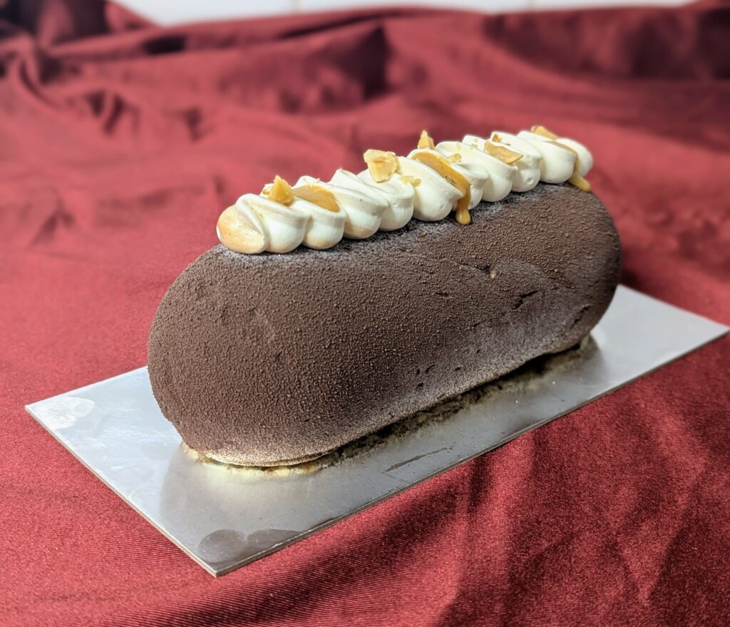 LA NOISETTE-CHOCO : Biscuit moelleux noisette, croustillant noisette, crémeux caramel chocolat noisette, mousse praliné noisette.