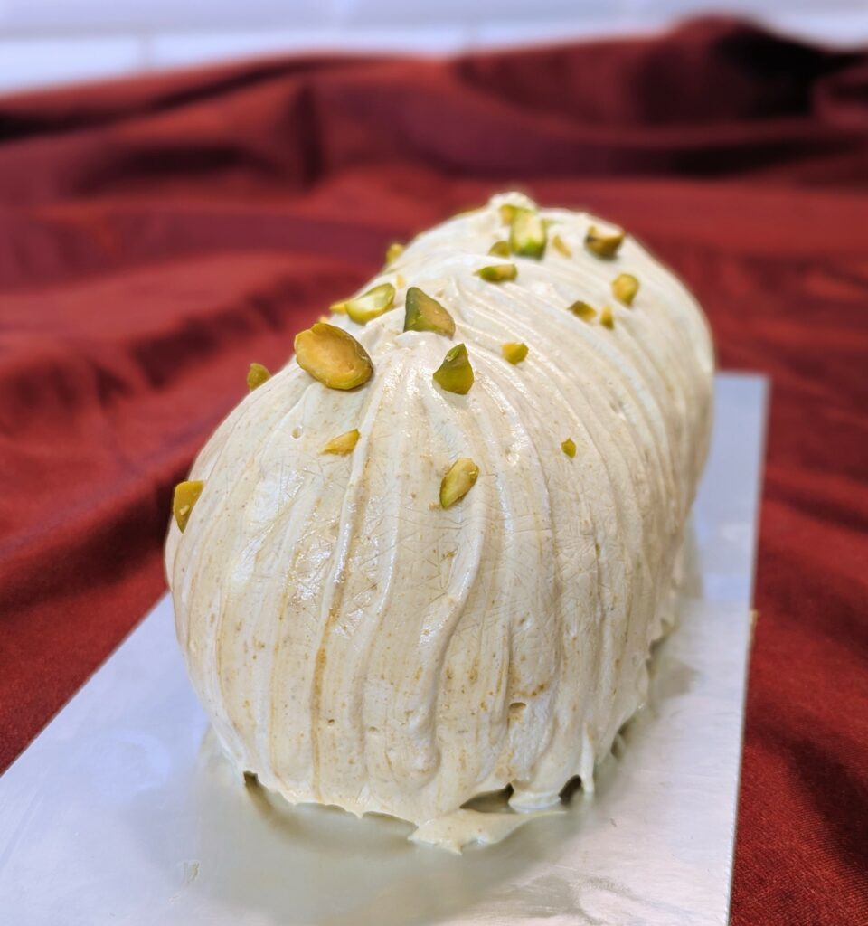 LA PISTACHE-FLEUR D’ORANGER : Biscuit moelleux pistache, croquant praliné pistache, crémeux pistache, mousse légère fleur d’oranger.