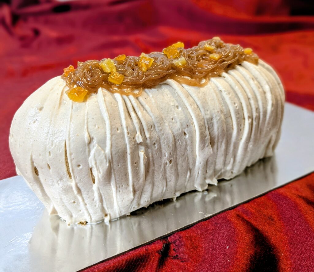 LA MARRON-CLÉMENTINE : Biscuit moelleux aux épices, confit de clémentine corse, mousse légère à la crème de marron vanillé.